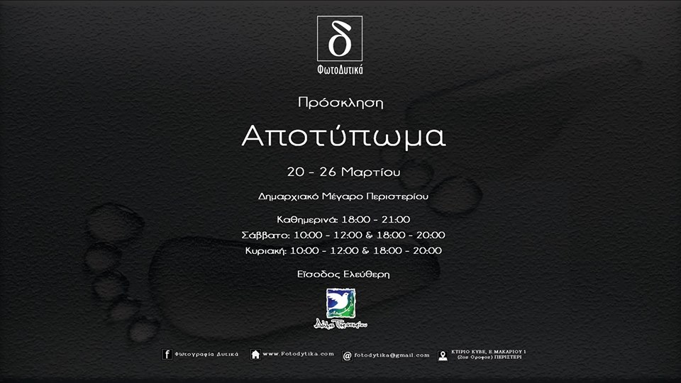 1 Published 9 Ιανουαρίου, 2018 at 960 × 540 in «Αποτύπωμα¨ στο Πολιτιστικό Συνεδριακό Κέντρο του Δημαρχείου Περιστερίου Διάρκεια έκθεσης 20 – 26 Μαρτίου 2017 Επόμενο →